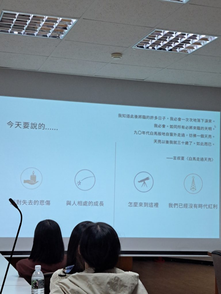 以前覺得自己不喜歡處在女生很多的地方,因為部分女生心思較為細膩,相處起來需要比較小心翼翼,若一不小心冒犯到對方,可能遭遇被斷崖式絕交。但這一次雖然女生很多但體驗感很好,不知道是因為年齡跨度大,所以不會落入競爭的情境,還是因為參加者都是對文學、寫作有興趣的人,有熱愛的事情並且為其投入心力,就比較沒時間去想其他有的沒的想法。至今仍未能想透其中緣由,但無論原因是什麼,都翻轉了對於身處於女性群體的主觀經驗。